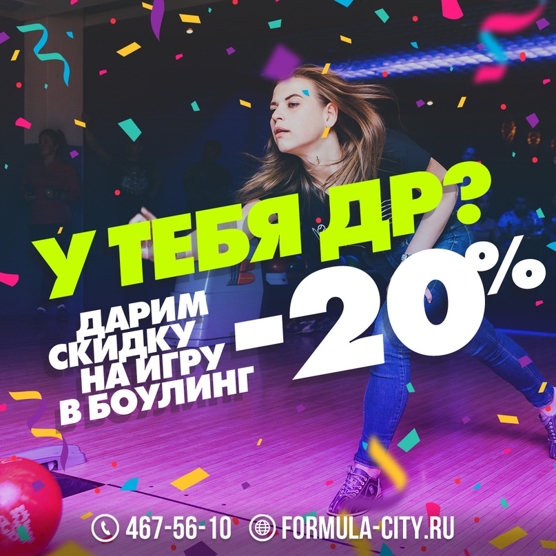 🎉 Отмечайте День Рождения в Formula City! Дарим скидку 20% именинникам на игру в боулинг и на всё меню в день рождения и ещё неделю