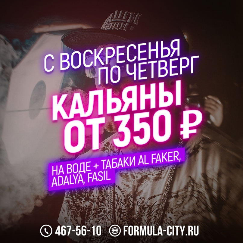 Дыми в Formula Bar с воскресенья по четверг — у нас самое выгодное предложение при заказе кальяна на табаках Al Faker, Adalya или Fasil 🔥 Бери