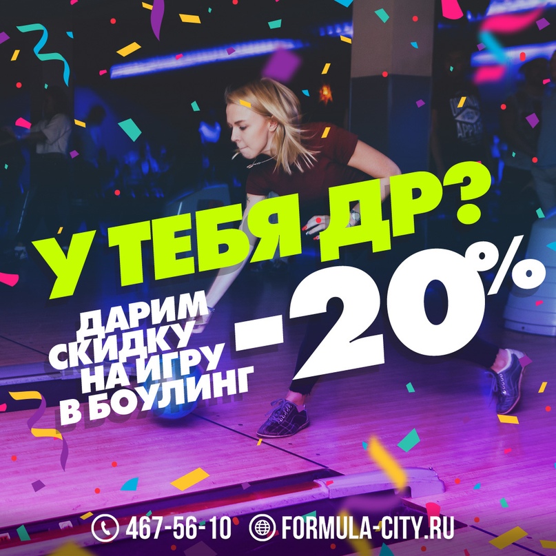 🎉 Отмечайте День Рождения в Formula City! Дарим скидку 20% именинникам на игру в боулинг и на всё меню в день рождения и ещё неделю