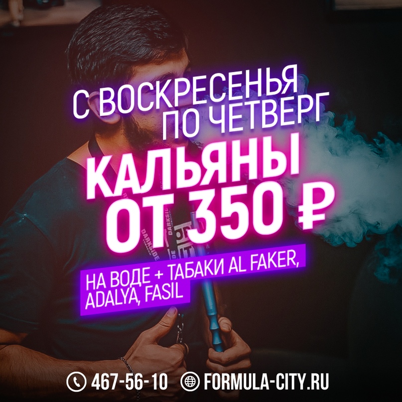 Дыми в Formula Bar с воскресенья по четверг — у нас самое выгодное предложение при заказе кальяна на табаках Al Faker, Adalya или Fasil 🔥 Бери